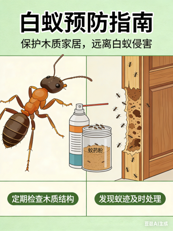 预防白蚁要保持室内干燥通风,及时清理积水与杂物,避免潮湿环境滋生蚁群。装修时对木质材料涂刷防蚁药剂,地基铺设防蚁屏障。安装纱窗阻挡有翅成虫飞入,装修时对木地板、门框、吊顶等木质材料做防蚁处理,减少蚁害隐患。平时关好纱窗,防止有翅繁殖蚁飞入筑巢。一旦发现蚁路、木屑或大量飞蚁,不要自行喷药惊扰,定期检查门框、地板、柜体有无蚁路、泥被。勿露天堆放木质家具,应及时联系宜兴白蚁防治所防治单位上门处理,从根源杜绝蚁患。